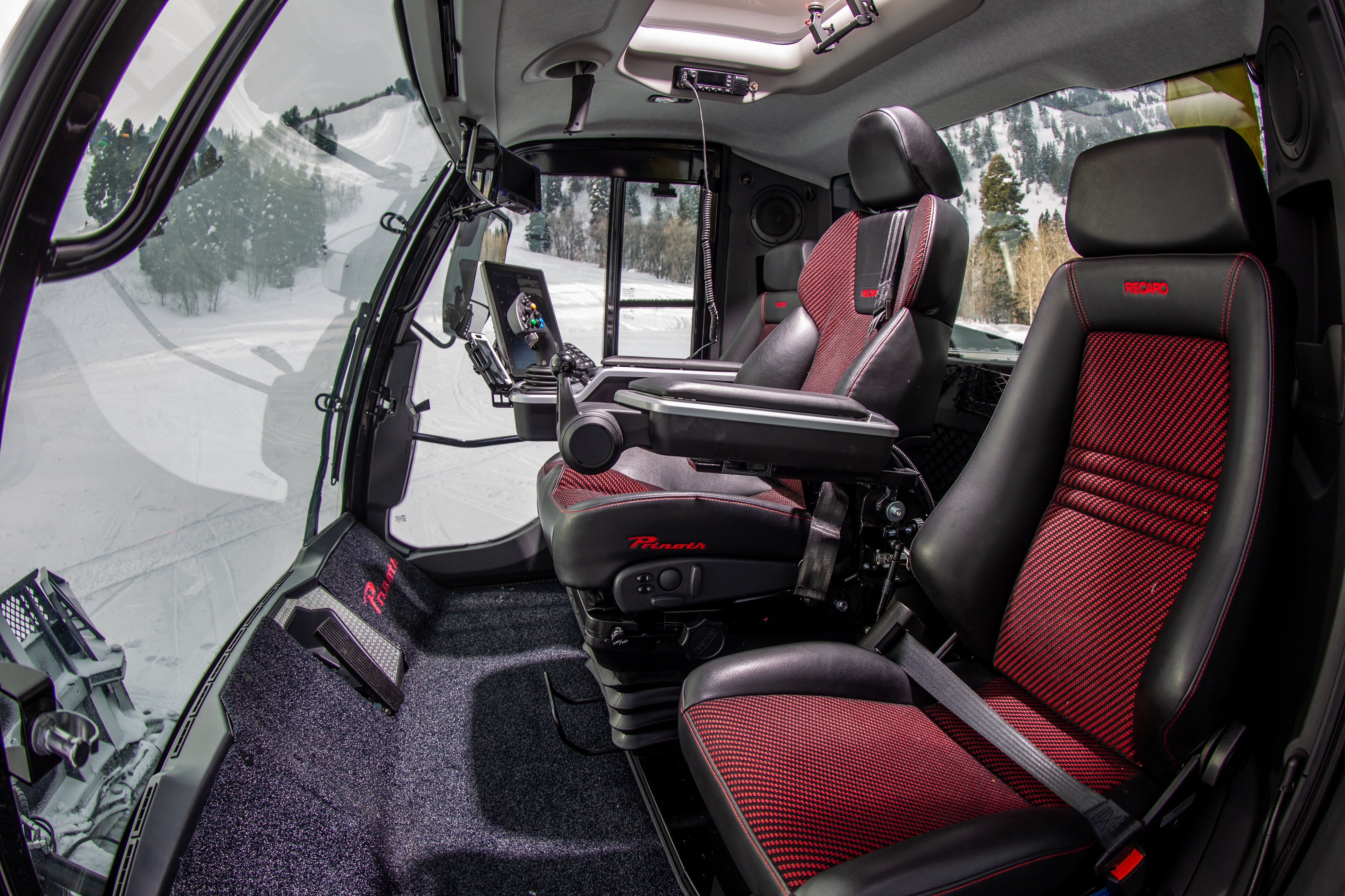 Le siège central de série et l'écran tactile inclinable offrent une excellente vue d'ensemble et permettent au conducteur d'entrer ou de sortir de la machine par l'un ou l'autre côté. Des sièges Recaro de taille normale supplémentaires pour les passagers font de le poste de pilotage redessiné le plus confortable à ce jour.
